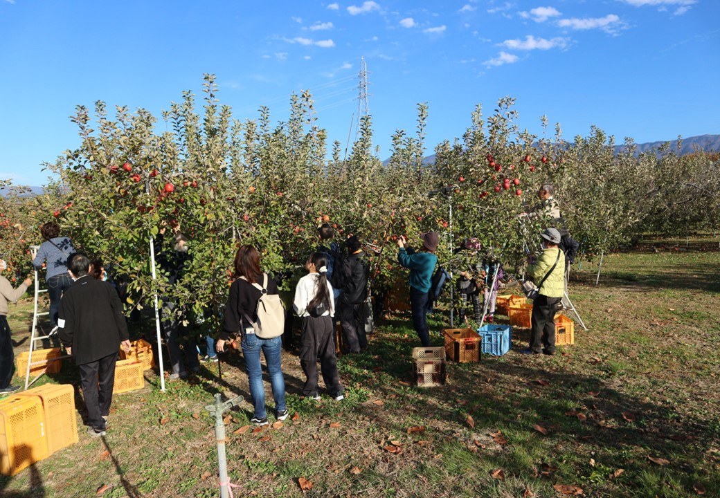 たかぎ伊久間原のりんご畑にたわわに実った完熟りんご。素晴らしい伊那谷の景色を眺めながらのりんご狩りはいかがですか?
